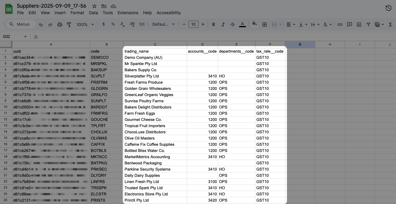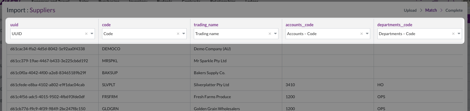 There are several fields that have similar names. For example, there is a UUID field, which is the UUID of the supplier. There is then another UUID field under each dimension (e.g. Tax Rate UUID).