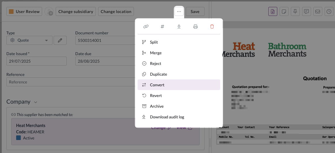 - You can choose to convert the original quote, or duplicate the document before converting and keep the original quote as a separate document