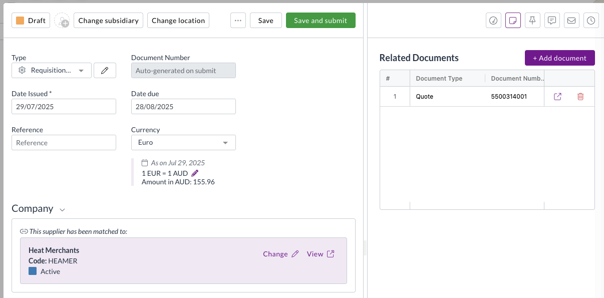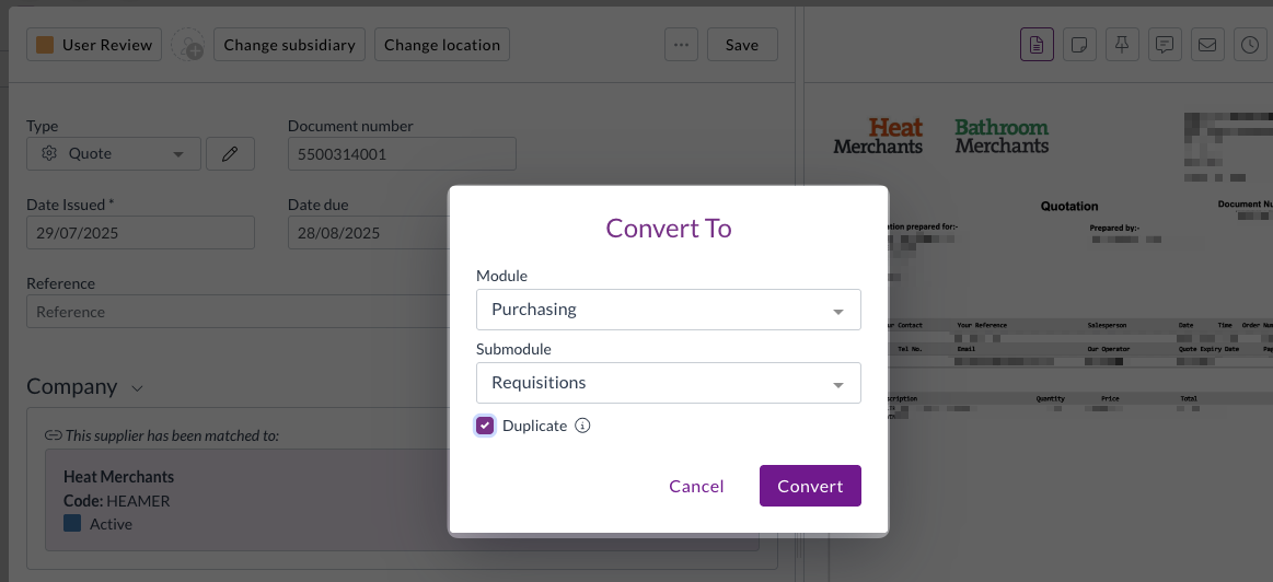 Streamline your procurement process by converting supplier quotes directly into requisitions.