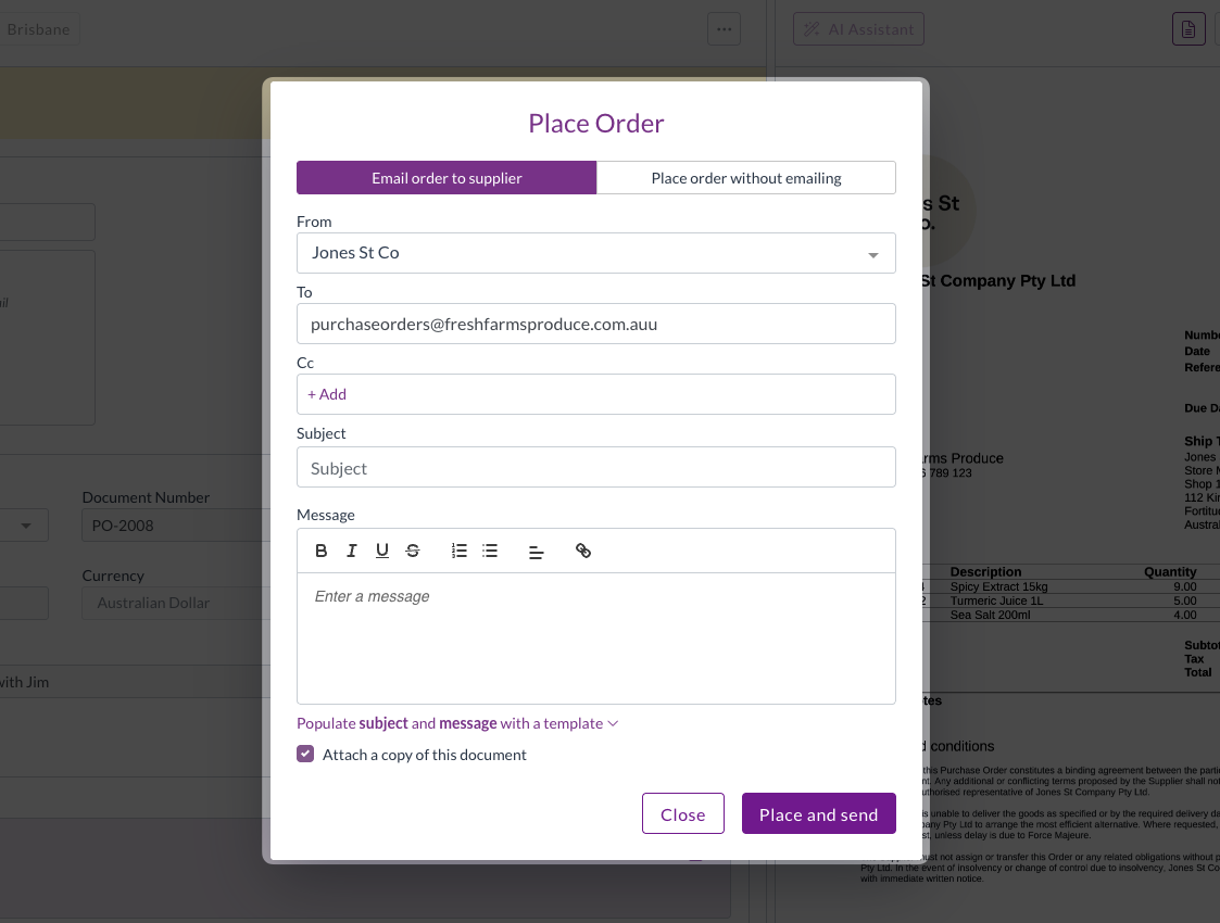 - If you are sending the PO via other means (e.g., supplier portal) but still want to update the status in Zudello, select Place order without emailing and click Place. This updates the status but doesn't send an email from Zudello.
