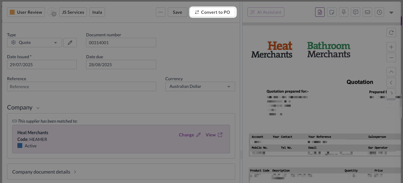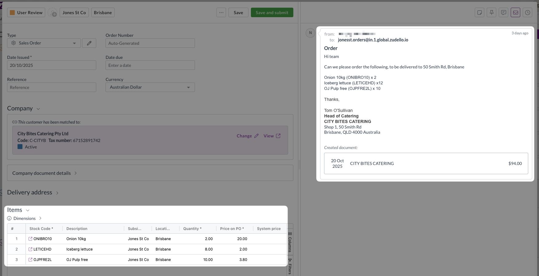 This feature is particularly valuable for businesses that receive orders via email rather than formal purchase order documents, streamlining the entire order capture process.